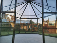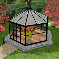 Tagpladerne er fremstillet i 6 mm polycarbonat for god isolering, mens sidebeklædningen består af 4 mm hærdet glas, som både er stærkt og elegant. Dette giver pavillonen et lyst og luftigt udtryk, samtidig med at den er bygget til at modstå det danske klima.