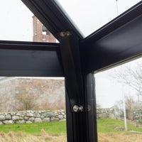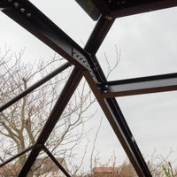 Vi har adopteret en unik metode til fastgørelse af polycarbonatplader eller glas, som også bruges i industri-drivhuse. Pladerne hviler mod et kraftigt T-profil, hvorpå et halvmåneprofil påmonteres og påskrues. Dette sikrer en robust fastgørelse, der modstår selv kraftige storme, og samtidig øger den den samlede styrke af konstruktionen.