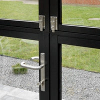 Royale-drivhusets fastgørelsessystem er inspireret af teknikker fra industridrivhuse. Glasset eller polycarbonatpladerne fastgøres sikkert med T-profiler og halvmåneprofiler, der skrues sammen for at klemme materialet på plads. Denne metode garanterer, at glasset eller pladerne bliver siddende, selv i de hårdeste storme. Resultatet? En utrolig robust konstruktion, hvor hele drivhusets struktur er forstærket af to sammenskruede aluminiumsprofiler.